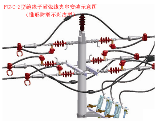 FGNC-Z型系列防雷绝缘子耐张线夹串适用于架空配电线路中,将架空绝缘导线或裸导线固定在耐张杆或转角杆的绝缘子上,从而将架空导线固定和拉紧;并将架空绝缘导线或裸导线连接在耐张杆或转角杆的金具上,从而将架空导线拉紧和耐张绝缘;设置有防雷引弧装置,起到防雷作用。